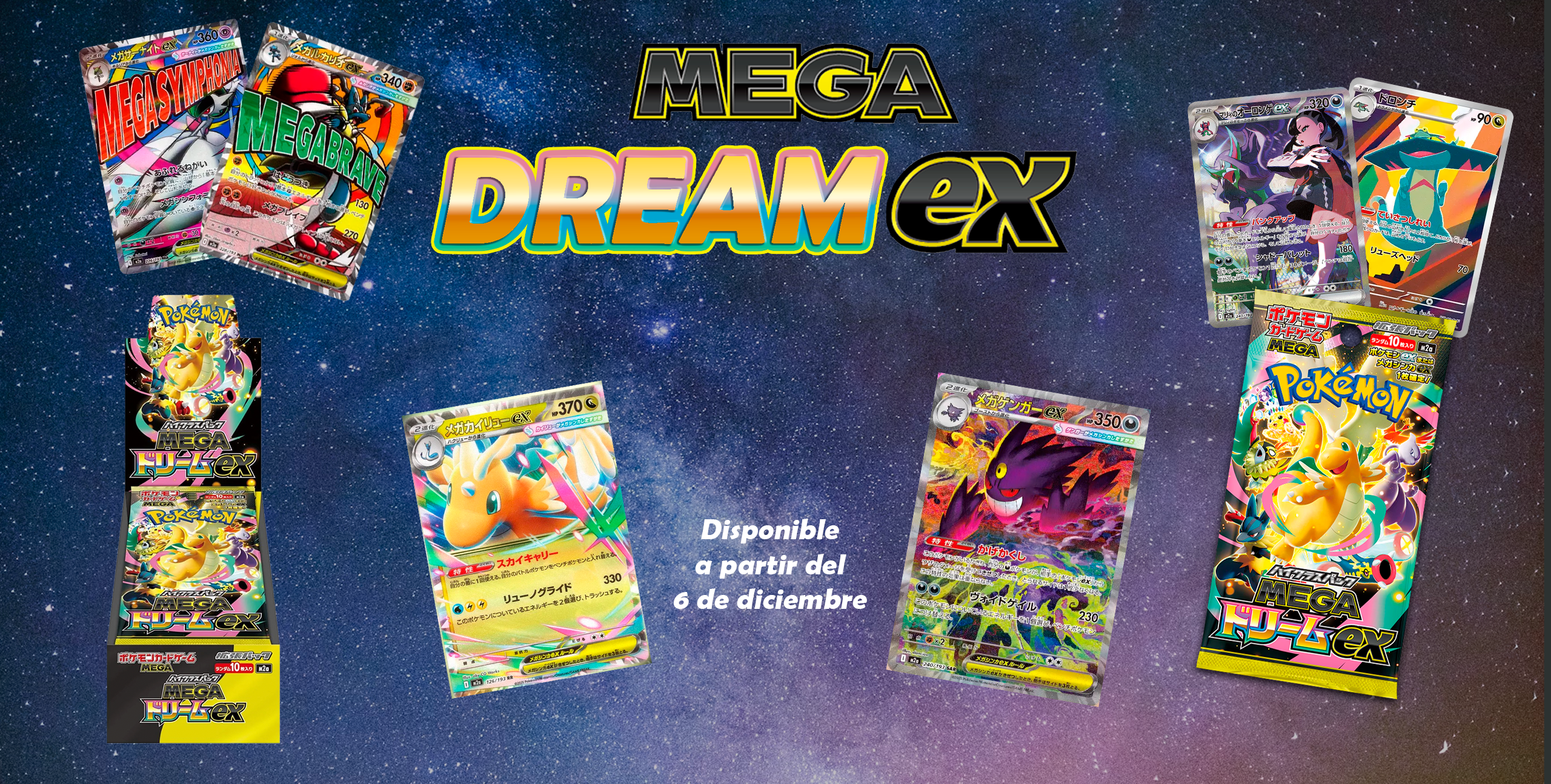 5 sobres aleatorios en japonés, inglés y/o español más 1 bonus que puede ser un sobre o una carta AR en japonés, inglés o español.